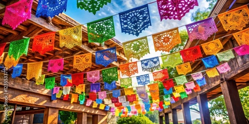 © Praphunsak, Naklejka premium Colorful papel picado hanging from a wooden archway over a vibrant outdoor celebration, festive atmosphere, vibrant colors