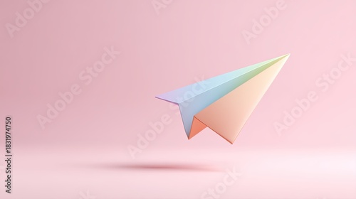 Naklejka premium Colorful paper airplane flying against a soft pink background, representing...