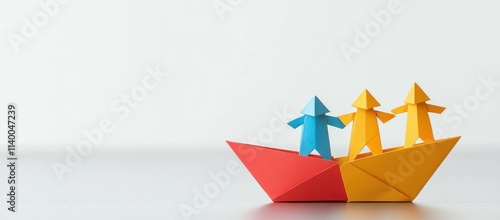 © silence, Naklejka premium Colorful paper boat with origami figures representing creativity and playfulness.