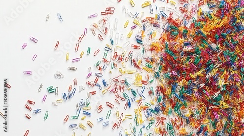 Fototapeta premium colorful paper clips strewn over a white background, visually representing...
