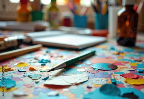 Fototapeta premium Colorful paper confetti and art supplies scattered on a creative workspace table