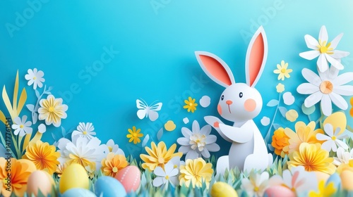 Fototapeta premium Colorful Paper Cut Easter Bunny in a Bright Spring Background