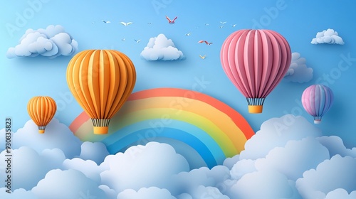 Fototapeta premium Colorful paper cut sky with hot air balloon,clouds and rainbow landscape...
