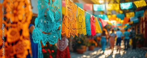 Fototapeta premium Colorful paper decorations at Mexican market, vibrant festive at