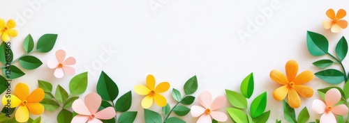 © BerkahStock, Fototapeta premium Colorful paper flowers and leaves border on white background.