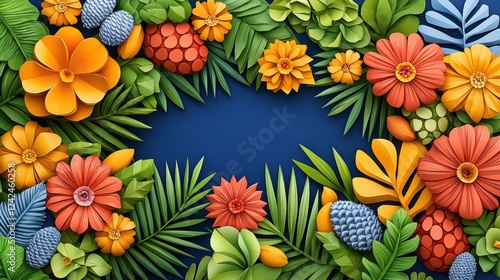 © JK_kyoto, Naklejka premium Colorful Paper Flowers and Leaves Frame on Blue Background