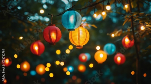 Fototapeta premium Colorful Paper Lanterns Hanging from Tree Branches at Night