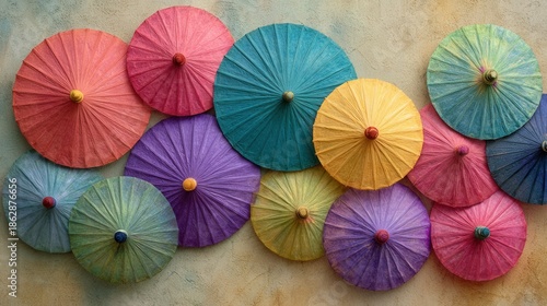 © nameera_juwairiya, Obraz premium Colorful paper parasols arranged on textured wall