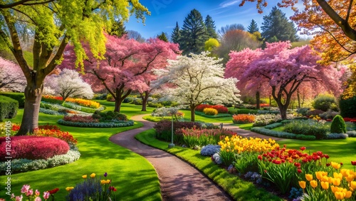 Naklejka premium Colorful park with a winding path and various flowers and trees