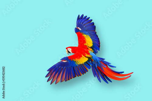 © Passakorn, Obraz premium Colorful parrot flying against a blue background.