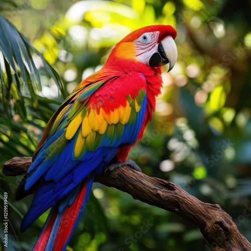 © Kittichet, Fototapeta premium Colorful parrot perched on a branch of a tree in a natural outdoor setting