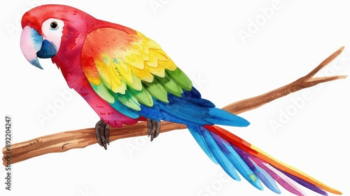 Fototapeta premium Colorful parrot perched on a branch, vibrant watercolor illustration on white background.
