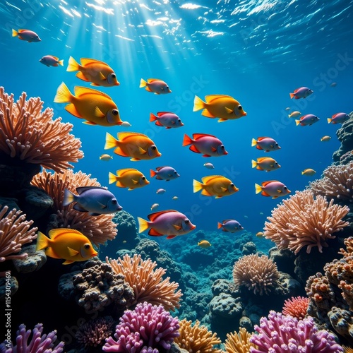 © Neuroillustrator3033, Fototapeta premium Colorful Parrotfish Juveniles Swimming on Coral Reef, Vibrant Marine Life, Side Perspective, Sunlit Water, Text Area, Vaporwave Aesthetic, For Digital Backgrounds or Social Media Posts