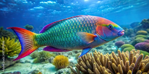 © Chanchai, Naklejka premium Colorful parrotfish swimming in Caribbean Sea, Guadeloupe