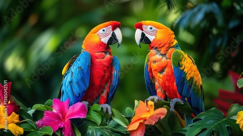 Obraz premium Colorful parrots among vibrant flowers