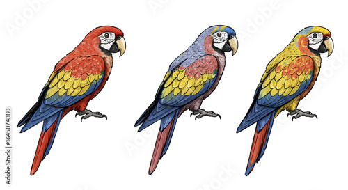 Obraz premium Colorful Parrots Illustration Three Birds with Bright Feathers on Transparent...