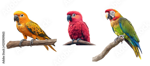 © h3design, Obraz premium Colorful parrots perched on branches displaying vibrant plumage in a tropical setting