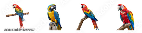 © Maestro, Naklejka premium Colorful parrots perched on branches with transparent background