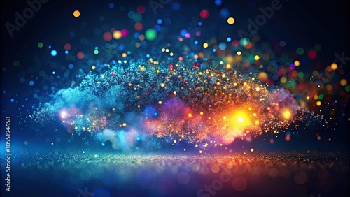 Fototapeta premium Colorful particle cloud on dark blue background with glowing bokeh light effects , particles, multicolored