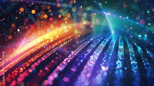 © Justlight, Fototapeta premium Colorful particles flowing and creating a big data stream with a beautiful bokeh effect and light rays, perfect for technology and communication concepts