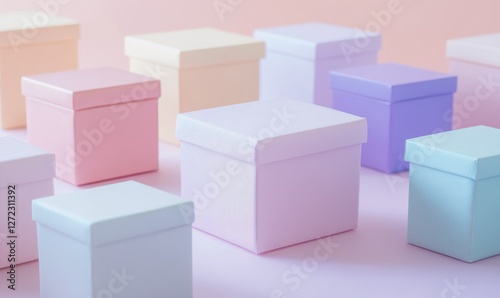© Tanya, Fototapeta premium Colorful pastel boxes arranged on a light pink background surface.