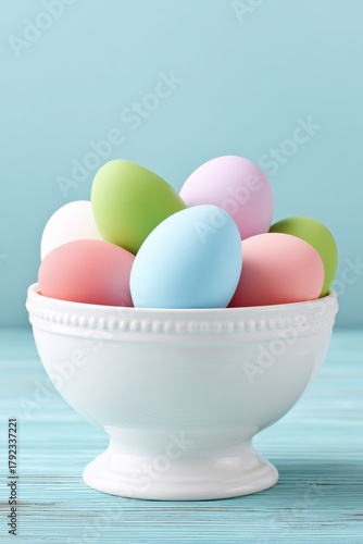 Fototapeta premium Colorful pastel Easter eggs arranged in a white ceramic bowl on light blue wooden surface with soft background, symbolizing spring celebration, festivity, and seasonal decoration
