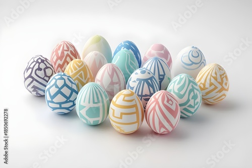 Fototapeta premium Colorful Pastel Easter Eggs with Modern Decorative Patterns on White Background