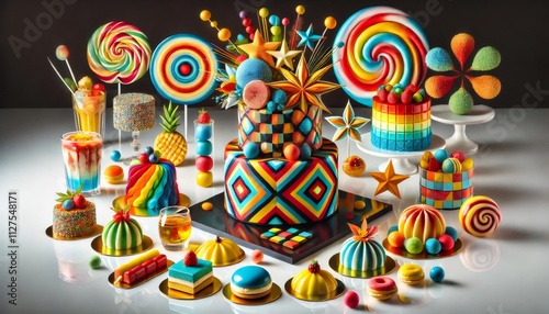 Obraz premium Colorful pastry display showcasing vibrant cakes, lollipops, and desserts