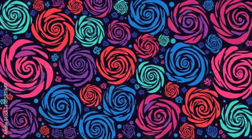 © kramynina, Fototapeta premium Colorful pattern of spirals on a black background