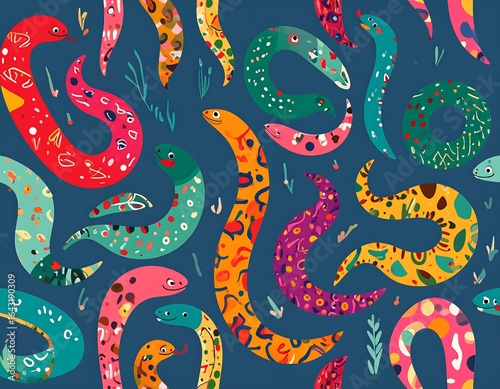 © ari, Obraz premium Colorful patterned snakes on dark background