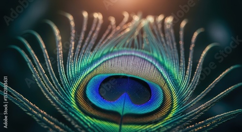 © Gilang, Naklejka premium Colorful Peacock Feather Closeup with Iridescent Blue Green and Gold Details in Soft Light