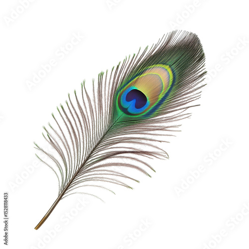 Obraz premium Colorful peacock feather resting gracefully on a white background showcasing...
