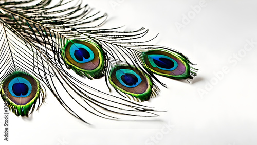 Obraz premium Colorful peacock feathers arranged on a white surface, emphasizing their...