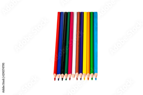 © Olga, Obraz premium Colorful pencils arranged at a row on a white background. Back to school.