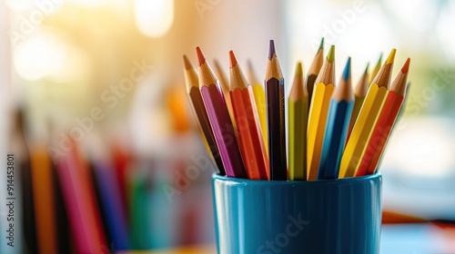 Obraz premium Colorful pencils arranged in a cup on a teacher's desk, offering a bright and...