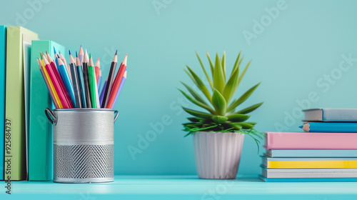 Obraz premium Colorful pencils in a holder with succulents and stacked books on a blue desk