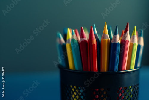 Fototapeta premium Colorful pencils in metal cup on plain background with copy space. Back to...