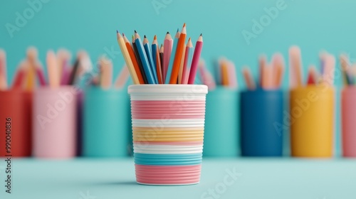 Fototapeta premium Colorful Pencils in Striped Cup with Blurred Background Representing...