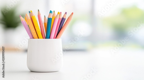 © MAKASIHMAS SIDNEY, Obraz premium Colorful pencils in white holder, desk, office background, art supplies