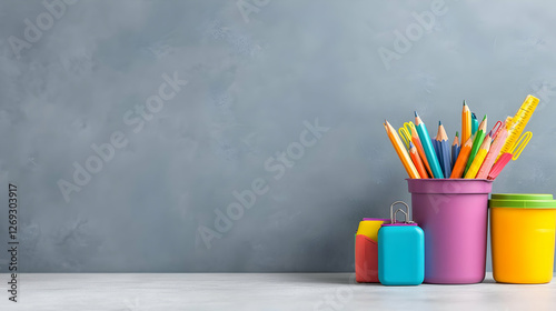 Obraz premium Colorful pencils, pens, and erasers on desk, grey background, back to school