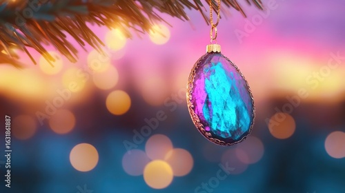 Fototapeta premium Colorful pendant hanging from a tree branch against a sunset backdrop