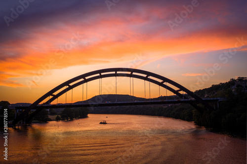 Naklejka premium Colorful Pennybacker Bridge Sunset from over River with mountains in the background and a boat on the lake | texas landmark