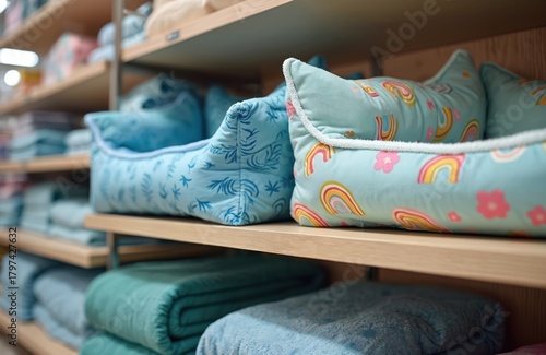 Obraz premium Colorful pet beds, soft blankets neatly arranged on wooden shelves in retail store. One bed features cute rainbow, flower patterns. Another bed blue leaf designs. Shop offers animal comfort items.