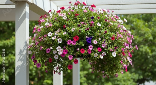Fototapeta premium Colorful petunias hanging basket white porch outdoor summer garden display....