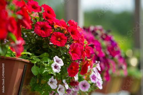 © Юлия Мальсагова, Obraz premium Colorful petunias in a flower pot on a terrace