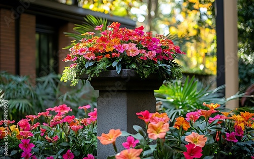 © AdibaZR, Naklejka premium Colorful petunias in a garden urn and surrounding flowerbed.