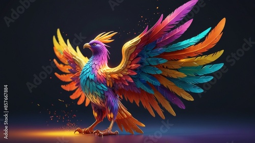 © Arceli, Obraz premium Colorful Phoenix bird abstract magic 3D on tale character illustration render hawk fairy wings feather from AI Generated