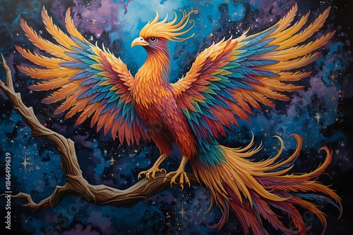 Fototapeta premium Colorful phoenix bird illustration with vibrant feathers and fantasy art style