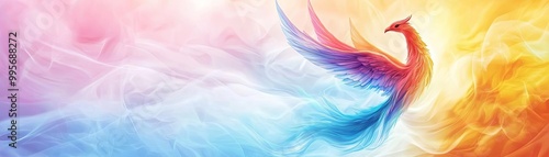 © Wasana, Obraz premium Colorful phoenix flying through vibrant flames and smoke on a dynamic background.