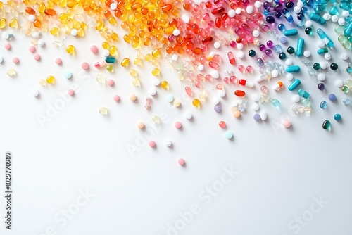 © kvladimirv, Naklejka premium Colorful Pills and Capsules Scattered on a White Background in a Vibrant Rainbow Pattern